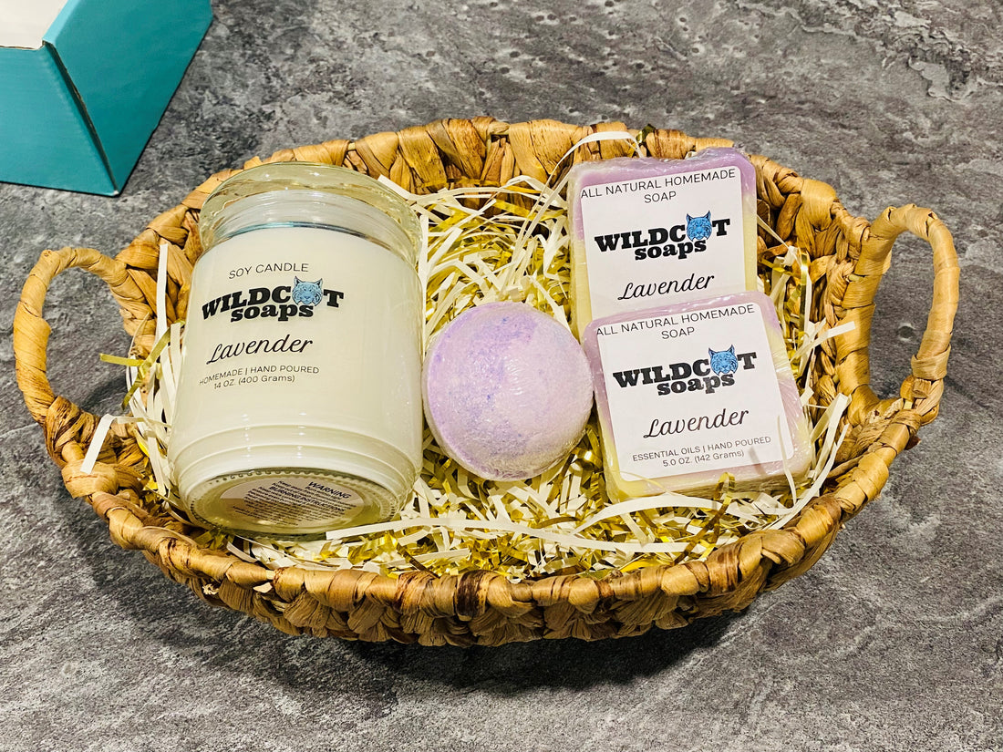 Our gift baskets are designed for special occasions—such as holidays—or as a thank-you or congratulations gift. The baskets come with one (1) - 14-ounce candle, one (1) bath bomb, and two (2) pieces of soap. Baskets come in 5 scents, such as Watermelon, Cucumber, Lavender, Coconut, and Eucalyptus.